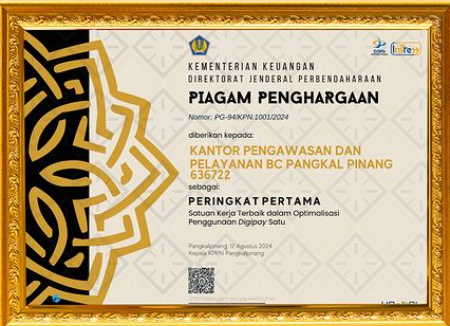 Sebagai bukti konkret upaya optimalisasi penggunaan Digipay, Bea Cukai Pangkalpinang berhasil meraih penghargaan di kegiatan Forum Konsultasi Publik dan Stakeholder’s Day yang diselenggarakan oleh KPPN Pangkalpinang sebagai Satuan Kerja Terbaik dalam Optimalisasi Penggunaan Digipay Satu Periode Semester tahun 2024. Kegiatan yang dilaksanakan pada Selasa, 20 Agustus 2024 ini bertujuan untuk meningkatkan kualitas layanan dan menyelaraskan standar layanan unit dengan kebutuhan stakeholder melalui pelibatan aktif publik serta penguatan koordinasi dan sinergi antara KPPN Pangkalpinang dengan seluruh pengguna layanan.